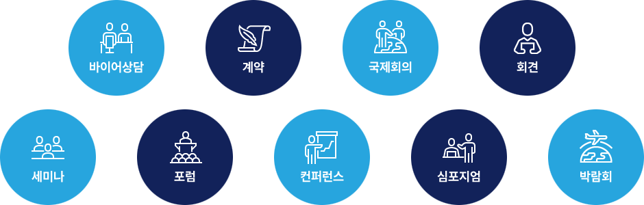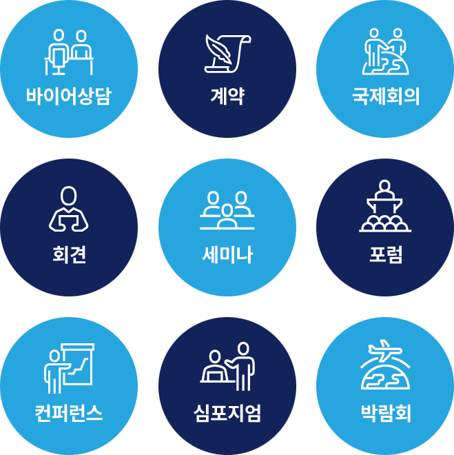 해외 75개국 105개 도시의 바이어상담, 계약, 국제회의, 회견, 세미나, 포럼, 컨퍼런스, 심포지엄, 박람회 등이 있을 때